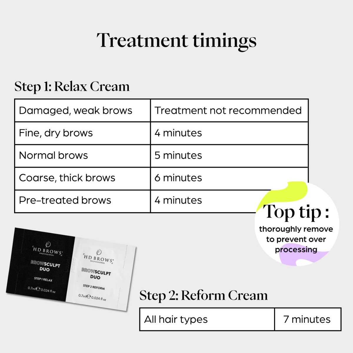 Always refer to your HD BrowSculpt training for a full breakdown on timings based on hair type to prevent over-processing.